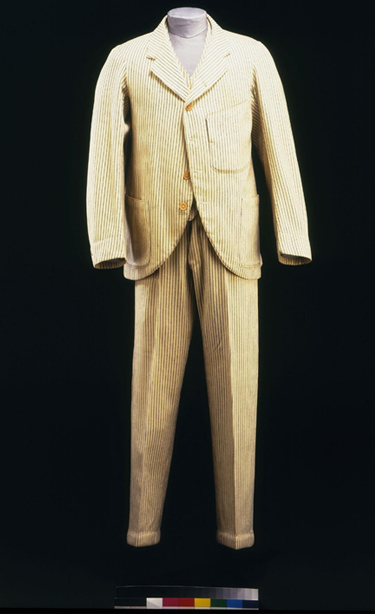 Colleen: While the Rational Dress Society focussed most of their efforts on women, they were not oblivious to the plight of men. Again, they encouraged comfort by advocating lighter-weight, relaxed clothing. The sack suit, (what a name), a single -breasted jacket without a waist seam first became popular with the working-class man and then made its way to the upper classes for day wear. Sportswear became popular, particularly stripped flannel suits with boater hats. (See below.) Formal wear was still de rigueur for evenings.