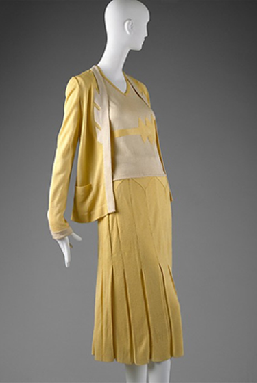In addition, sportswear was seen as suitable clothing for everyday activities. For instance, tennis-wear inspired sweater and skirt sets became popular. The photo below illustrates a tennis inspired day set. Not exactly what we consider sportswear today!