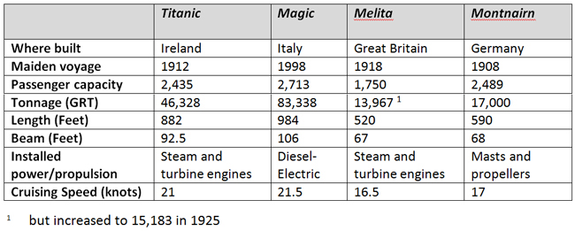 First of all, it must be said that the ships varied in size and manner of propulsion. Interestingly, for all of the years that have passed between the maiden voyage of the Titanic and the Magic and the vast improvements in technology that have been realized in the interim, the Magic cruises at a speed only slightly faster than the Titanic. The little difference may be a result of the tonnage of the Magic which is almost twice as heavy as the Titanic. It may also be a factor of preference. Part of the pleasure of a cruise might be its measured, calm pace.