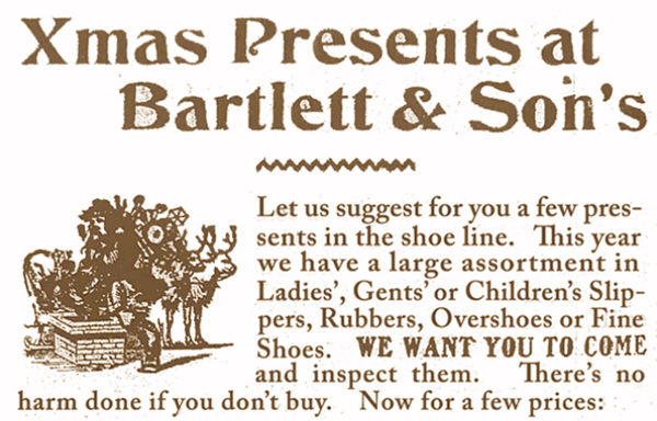 It seems that merchants and retailers have always relied on the holiday season to meet their yearly sales’ targets. In this article Joyful Old Christmas, I looked at the slogans and other implorations made by Brampton retailers in the December 19, 1907 issue of The Conservator, the local Brampton paper. Christmas was only six shopping days away.