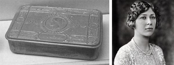 The gifts took the form of small embossed brass boxes that became known as Princess Mary’s Tins (her portrait and initials were embossed on the lid). The contents of the boxes varied to suit the needs of the men and women receiving them. For instance, smokers received tobacco, cigarettes and a tinder lighter, while non-smokers received a khaki writing kit with paper and a pencil and acid tablets. Indian service men received sweets and spices and nurses received chocolate. All boxes contained a greeting card with wishes of Merry Christmas and a Victorious New Year and a photograph of Princess Mary. Nearly half a million tins were distributed by Christmas Day.