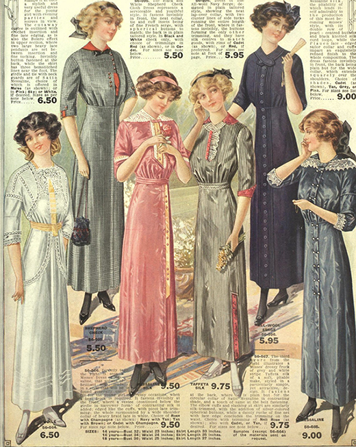In this, however there is a difference from the situation in 1909 where there were few ready-made pink day dresses on offer. While pink fabric was available for purchase by the yard for custom made dresses (in satin, broadcloth and wool), it seems that retailers like Eaton’s were not confident enough in the likelihood of sales to include many pink day dresses among their ready-made black, tan and cadet (what we would call teal) offerings. The difference may be accounted for in the post-war mood of 1919, and the desire of all those who had survived the war’s ravages for a lighter, gayer existence, the mood that ushered in the roaring twenties.