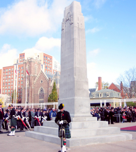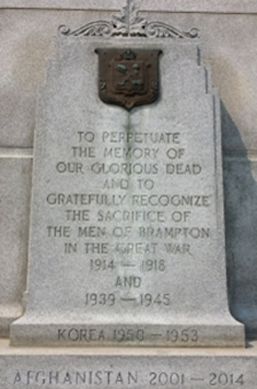 On Armistice Day 1928, Bramptonians again gathered at the cenotaph. During the ceremony, a crypt covered by a bronze plaque was opened. Placed in it was a book containing the names of the fifty eight Bramptonians who made the supreme sacrifice during World War I and the eight Bramptonians who served and perished since. A list of the fallen and other details regarding the cenotaph are available in the Order of Service for the unveiling ceremony available here.