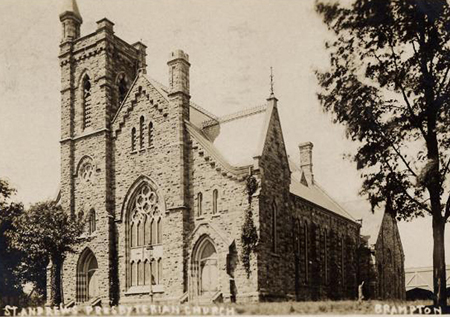 Jesse and Louisa Perry had at least three homes in Brampton. The first, built when they arrived in 1857, was a wooden “shanty” on the western outskirts of the village, on the south side of the Grand Trunk Railway tracks. Just across the tracks was “Albert Lowes’ bush in which were several Indian camps.” Later the wooden “shanty” was replaced by a brick house. In time, the family moved to a new home be built on Alexander Street, near the Central School. The house was called Woodbine Cottage.