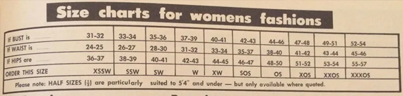 In fact, the sizing issues created real problems for the mail order catalogue industry: for both women purchasing, and vendors selling, female garments. For a man, the measurement of his chest was a good indicator of the size of jacket and shirt he would require. With those items and the pants sold as separates, the ordered male clothing was likely to fit or to fit with some minor alterations.